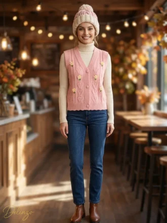 ژیله بافت زنانه دکمهدار طرح شکوفه و قلب برجسته