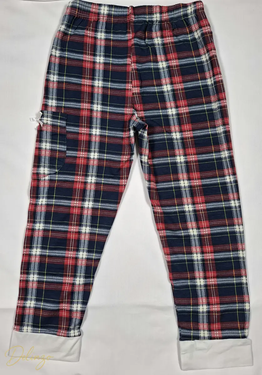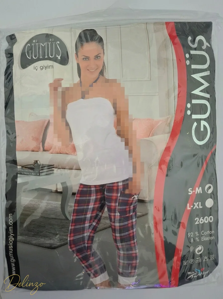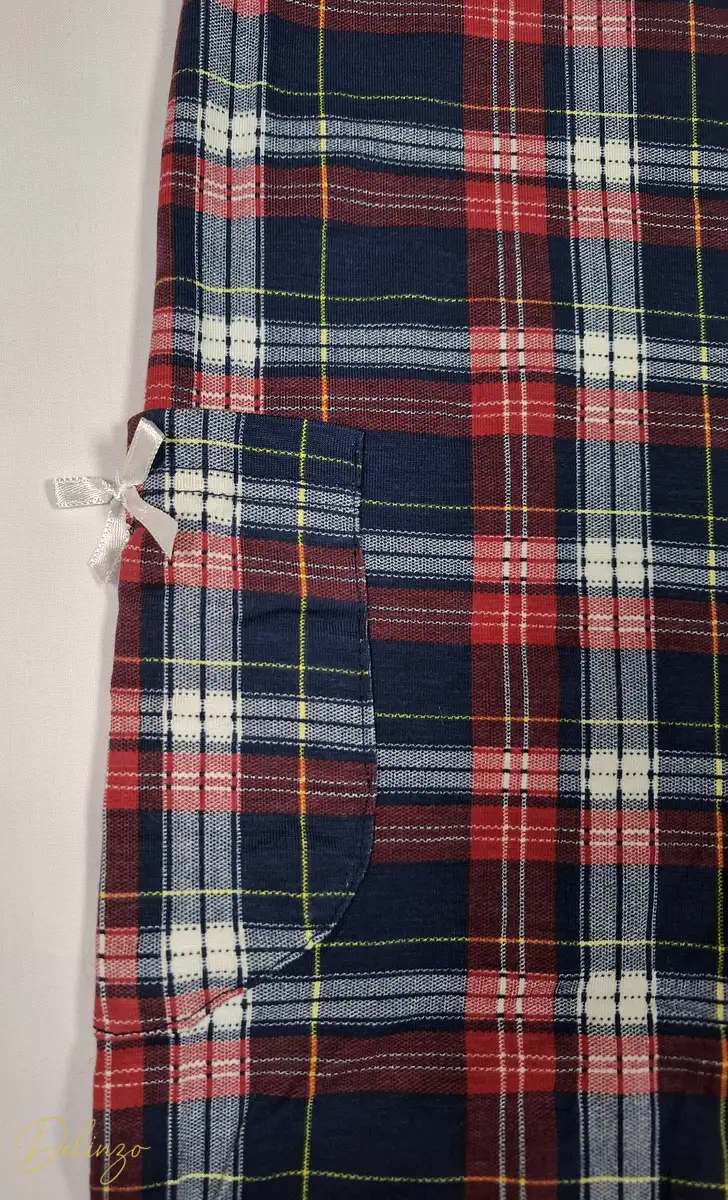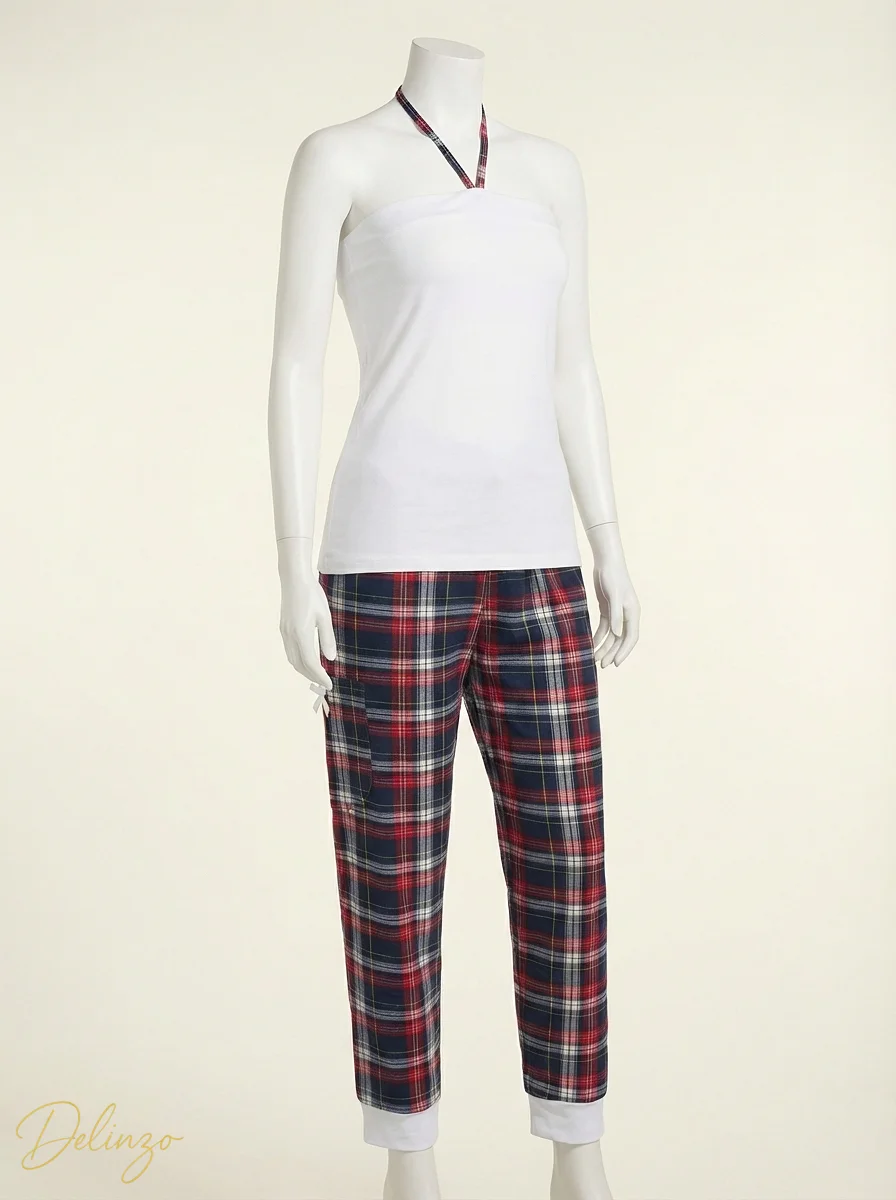 این ست لباس راحتی زنانه شامل یک تاپ بندگردنی (Halter-neck) ساده و یک شلوار کمرکشی است که از پارچه تمام نخی (۱۰۰٪ پنبه) نرم و خنک تهیه شده است و برای استفاده در فصول گرم و به عنوان هومور ایدهآل است. تاپ این ست به صورت ساده و جذب طراحی شده. شلوار با طرح چهارخانهی درشت (Plaid/Tartan) طراحی شده است، که الگوهای متفاوتی از خطوط متقاطع دارد و تضاد بصری زیبایی با سادگی تاپ ایجاد میکند. شلوار دارای کمر کشی برای فیت راحت و دمپاهای نواردوزی شده است.