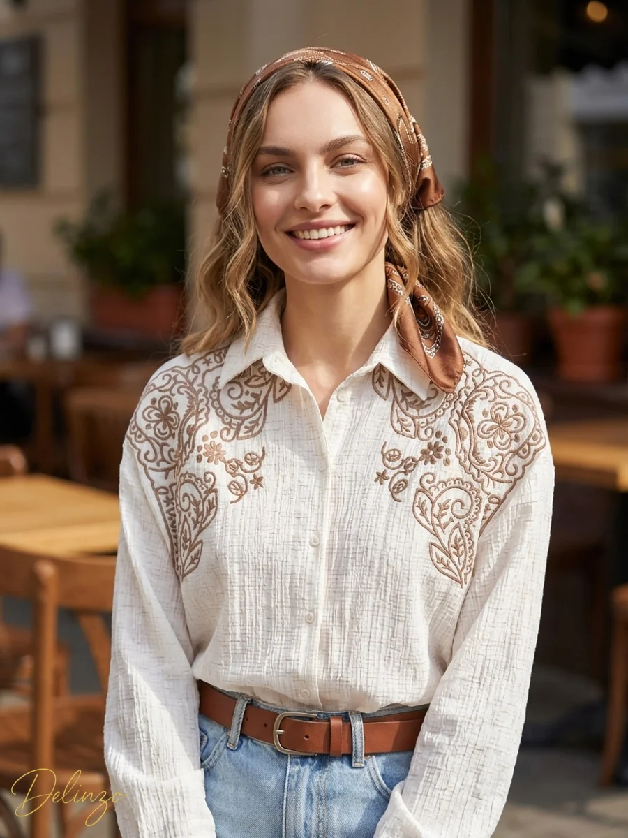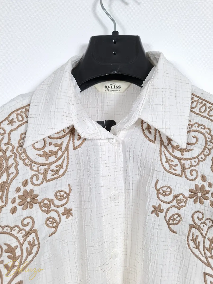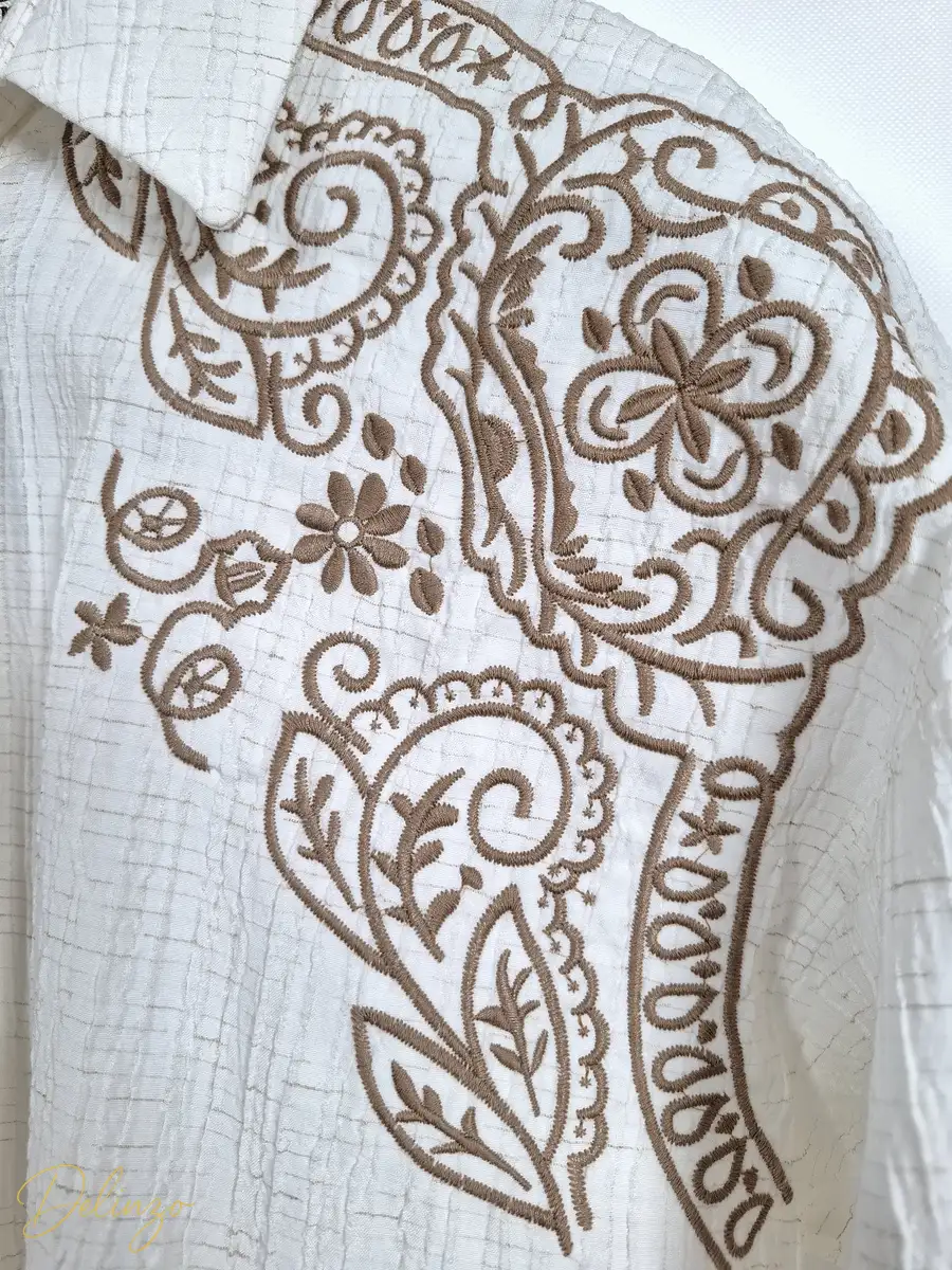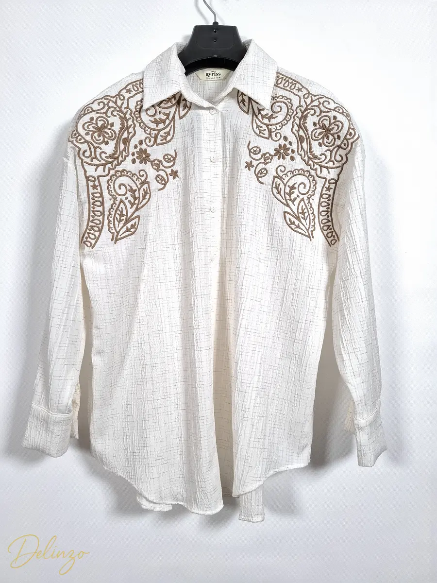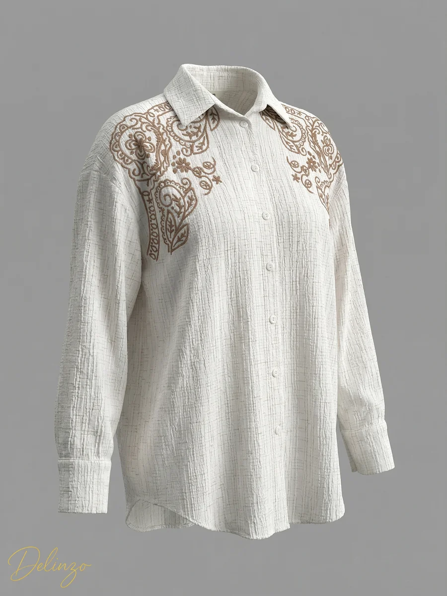 شومیز کتان کرینکل رگهدار آستین بلند با گلدوزیهای پرکار طرح بتهجقه روی سرشانهها، مناسب استایل غیررسمی شیک.