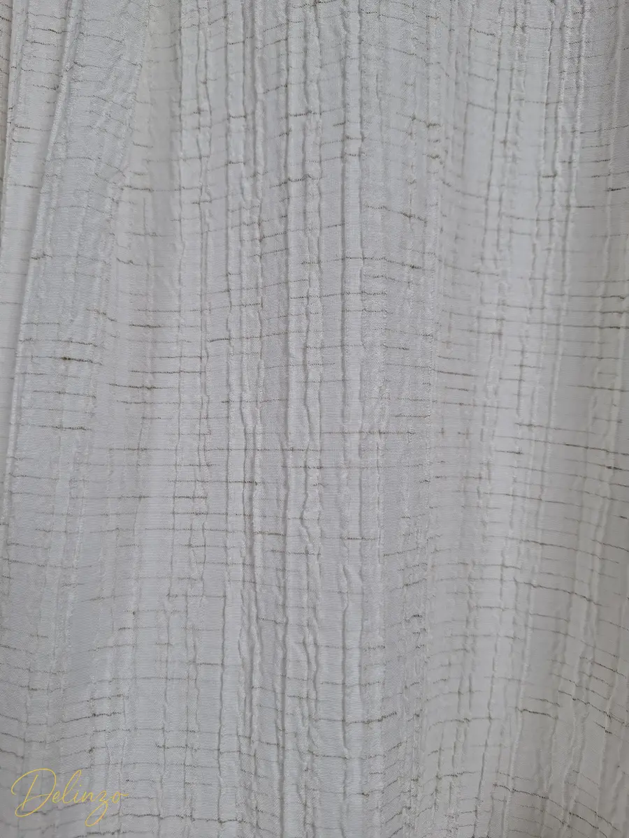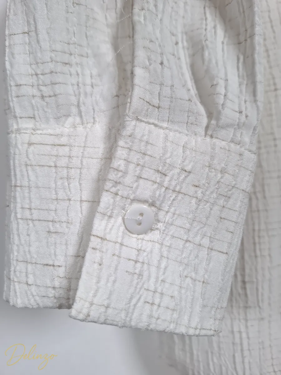 این شومیز زنانه با جنسی از کتان کرینکل رگهدار تهیه شده که به دلیل بافت خاص خود، چروکهای طبیعی و ظریفی دارد که نیاز به اتوکشی را کاهش داده و ایستایی غیررسمی و زیبایی ایجاد میکند. مدل این شومیز دارای آستین بلند، یقه برگردان مردانه و دکمههایی از جلو است. ویژگی متمایز این لباس، گلدوزیهای پرکار و ظریف با طرح بتهجقه/اسلیمی است که به صورت متقارن روی قسمت سرشانهها و سینه شومیز کار شده و جلوهای سنتی-مدرن و شیک به آن میبخشد. برش لباس به صورت نسبتاً آزاد و ریلکس است و لبه پایین آن حالت هلالی و نامتقارن دارد که کمی از پشت بلندتر است و آن را برای پوشیدن روی شلوار یا استفاده آزاد مناسب میسازد.
