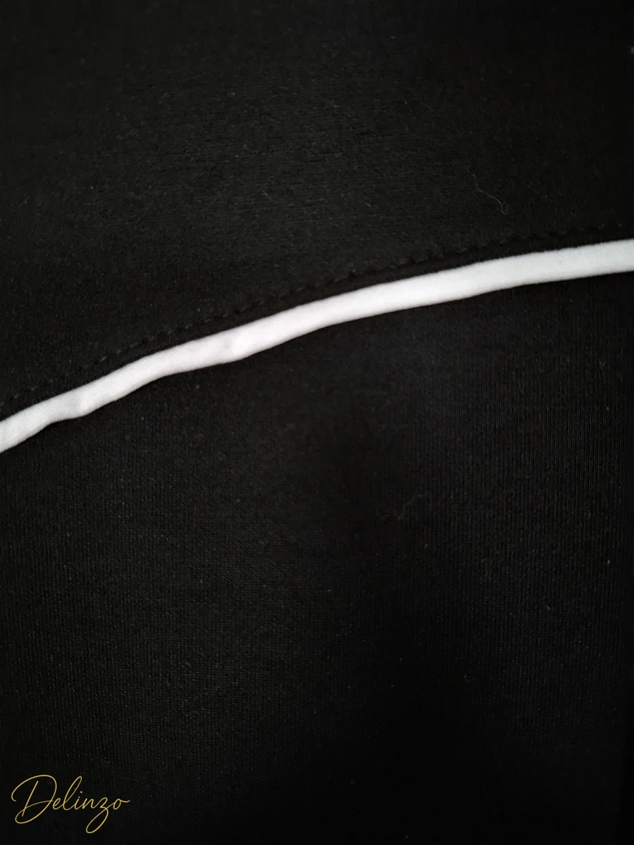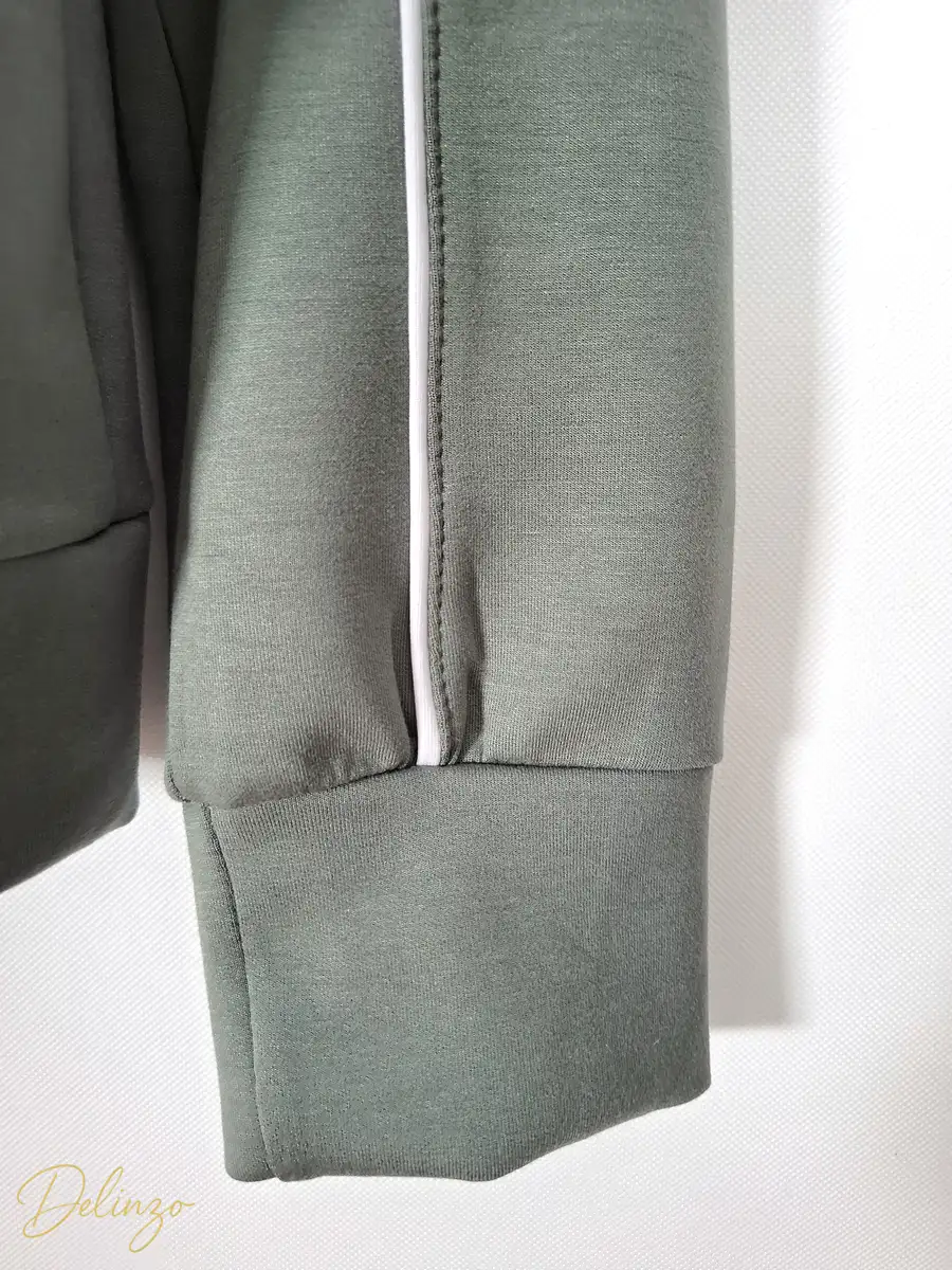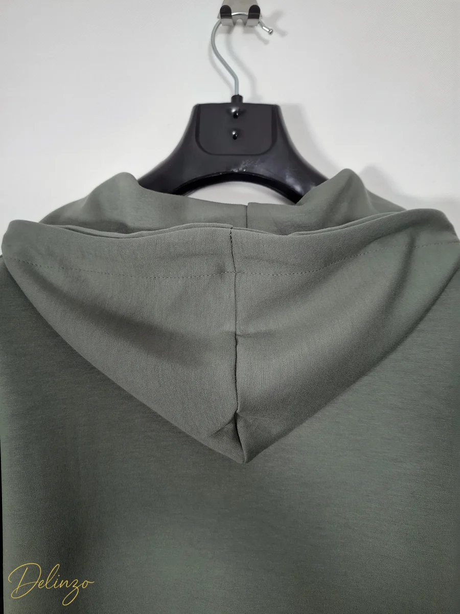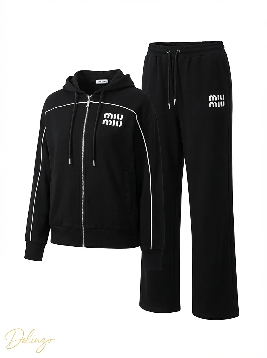 ست دو تکه شامل سویشرت کلاهدار زیپدار و شلوار راسته کمرکشی، با پارچه نرم و کشی و تزئینات خطی مدرن.