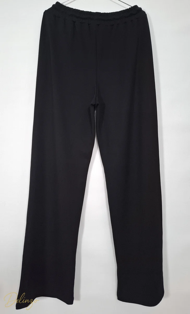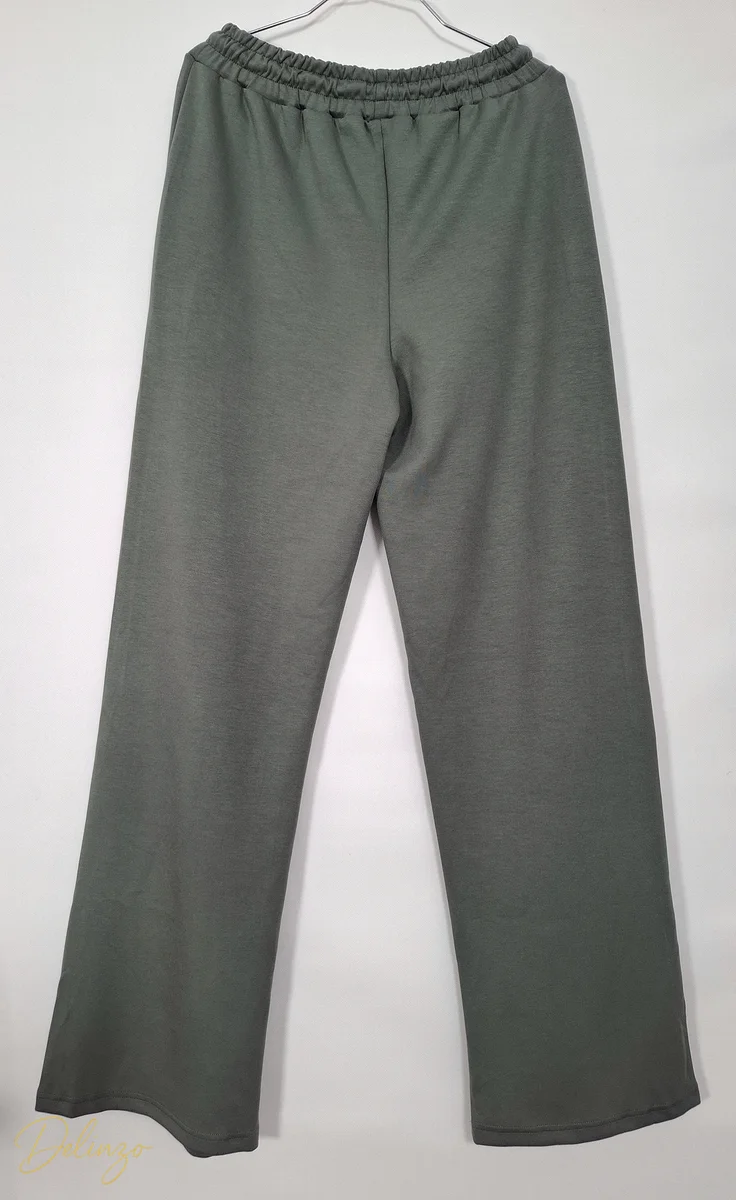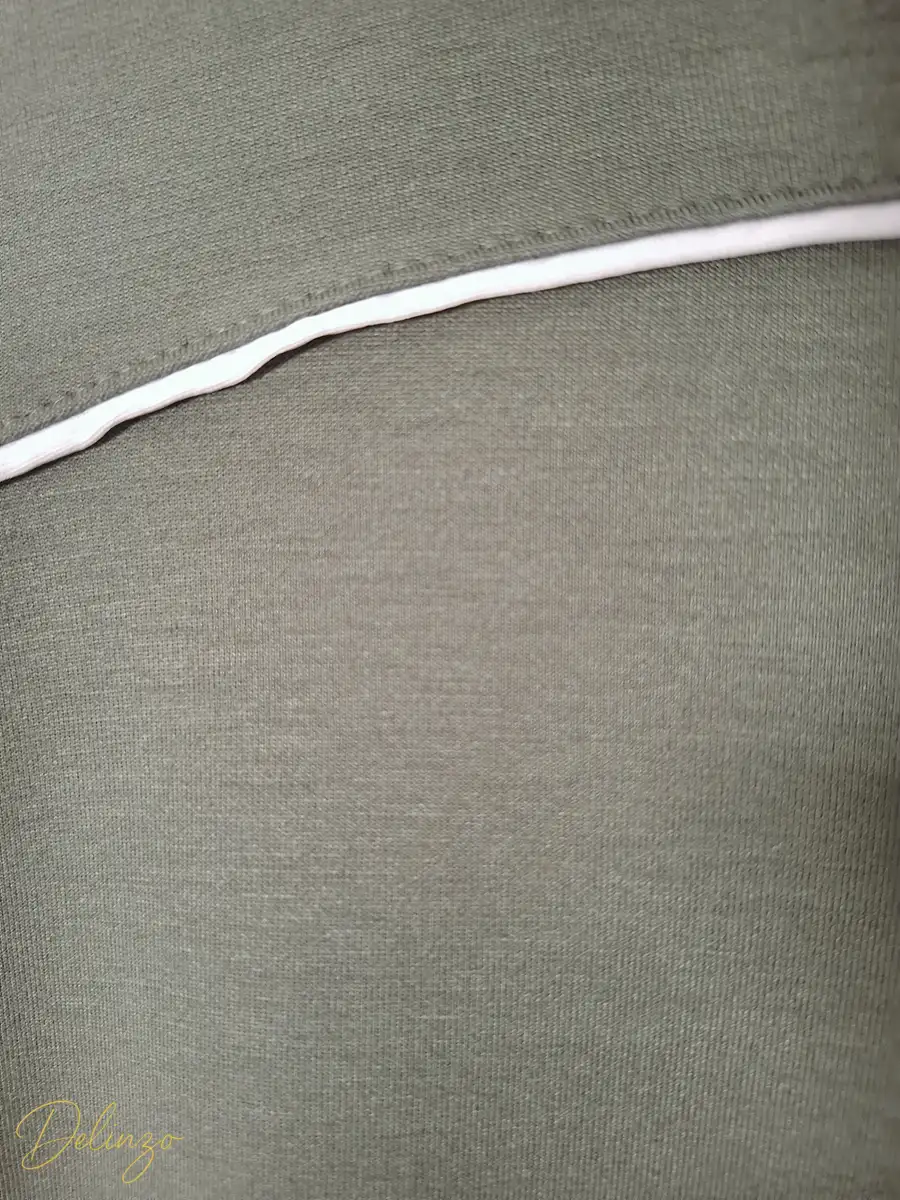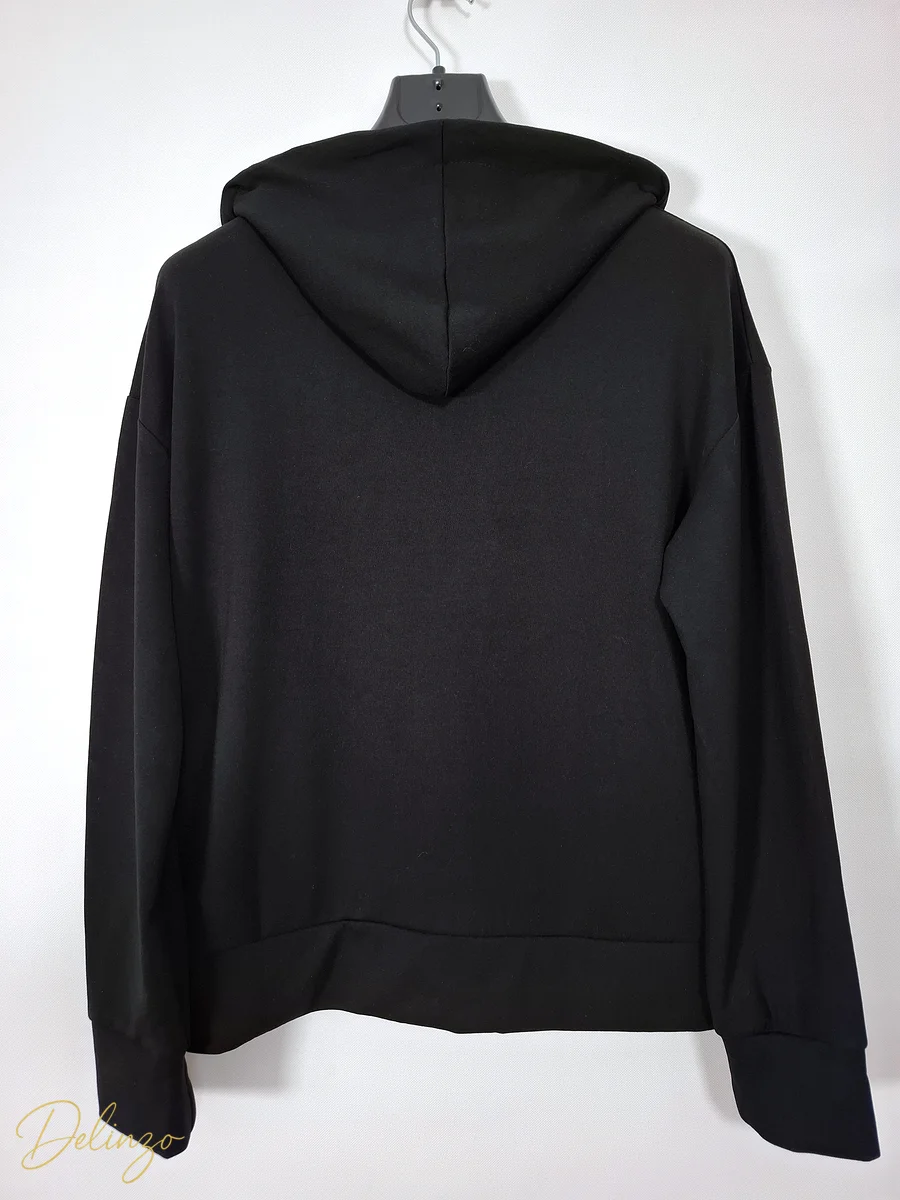 ست دو تکه شامل سویشرت کلاهدار زیپدار و شلوار راسته کمرکشی، با پارچه نرم و کشی و تزئینات خطی مدرن.
