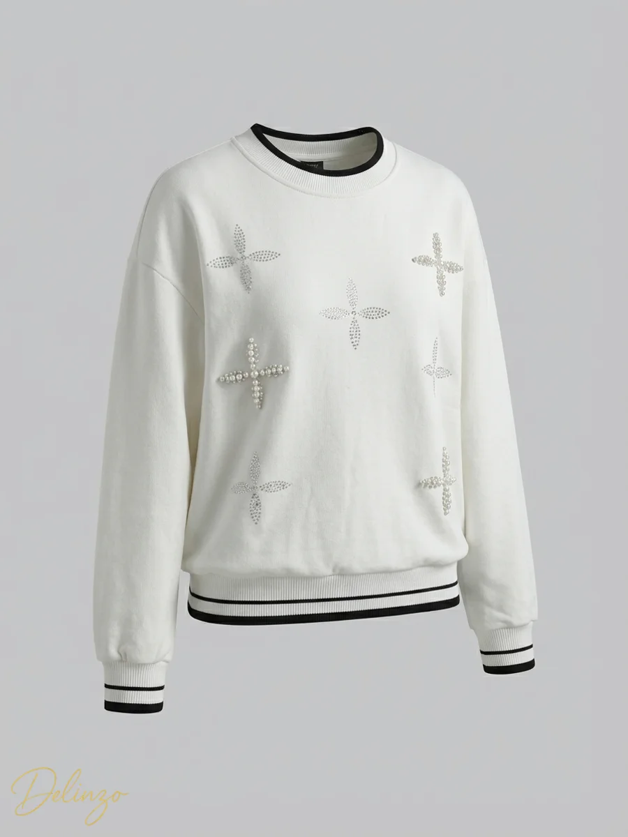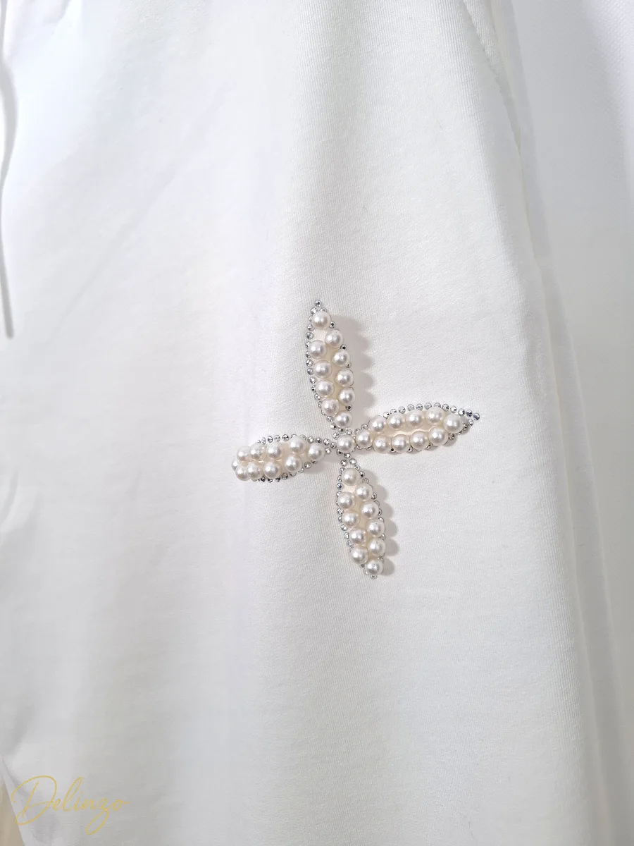 ست بلوز یقه گرد و شلوار دمپا آزاد با تزئینات نگیندار طرح گل، ساخته شده از پارچه نرم و لطیف با درصد پنبه بالا.